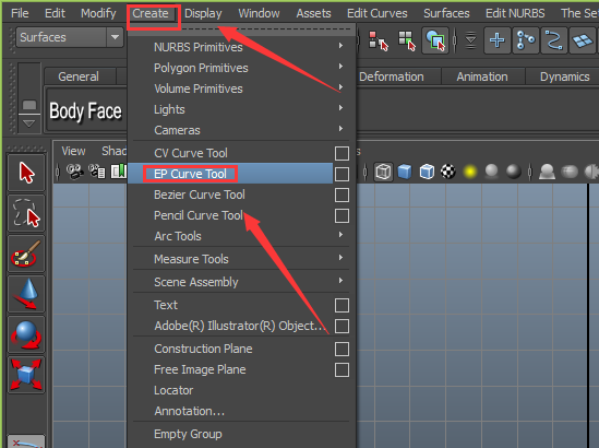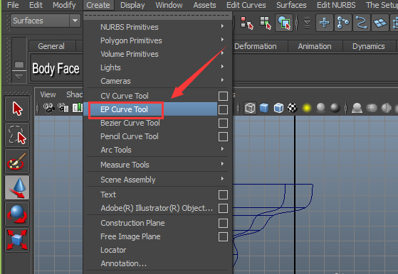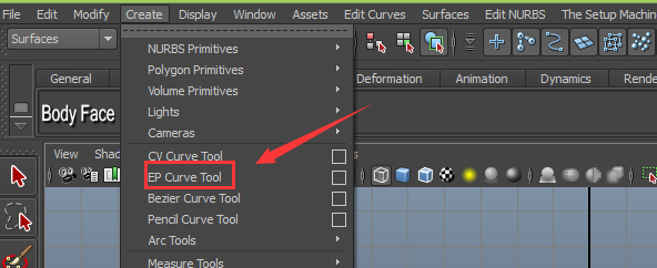 2、在該界面內找到create菜單,點擊create菜單在其子級菜單里找到EP curve tool命令,如圖所示: