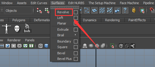 5、在菜單里找到surface菜單,點擊surface 菜單,在其子級菜單里找到revolve命令,如圖所示: