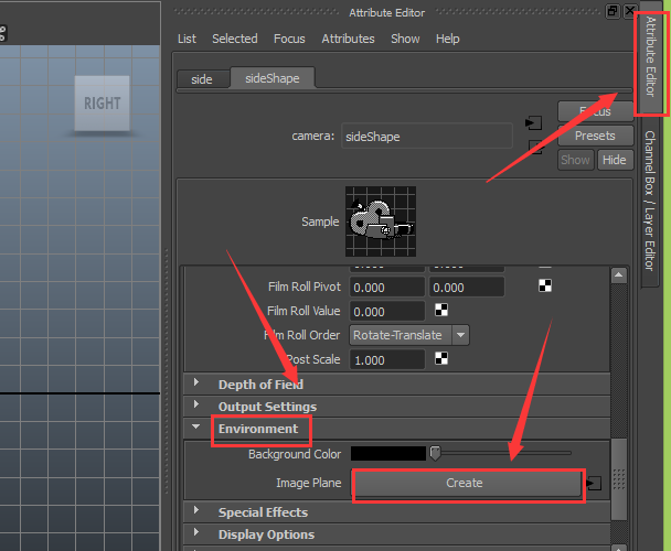 5、點擊side攝像機,在屬性里找到create選項,如圖所示: