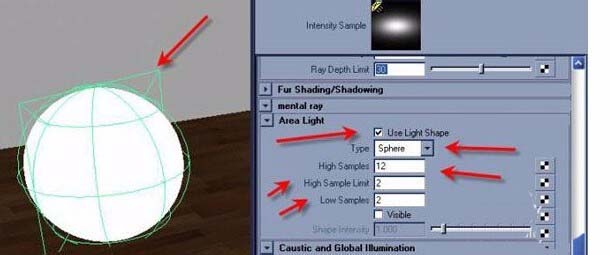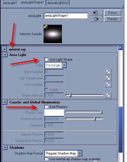 6、選中燈光,,打開Mental ray,打開了Global illumination。Use Light Shape(燈光的形狀),你能將你的燈光形狀改為Disk(圓盤),(Sphere)球體,(Cylinder )圓柱體,以及用戶自定義,Emit Photons(發射光子),光子是一些導致場景內非直接反射的小點,在它們衰亡之前,會在物體間不停的反射。