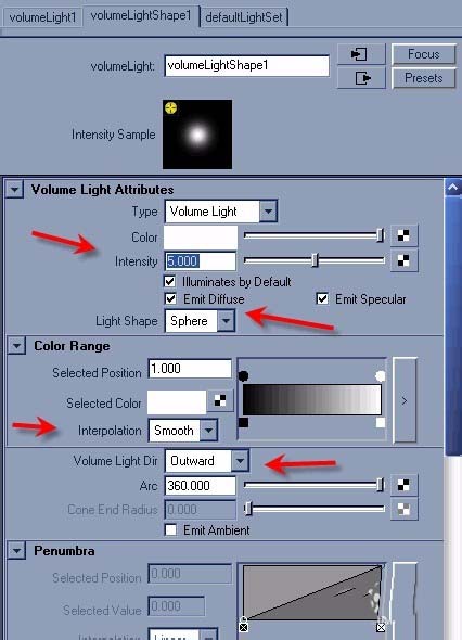 15、增強燈光強度到5,燈光形狀設成 Sphere,將Interpolation設為SmoothVolume Light Dir設成outward,這將會使燈光會從內向外,而且會很直。 Arc是燈光的角度,