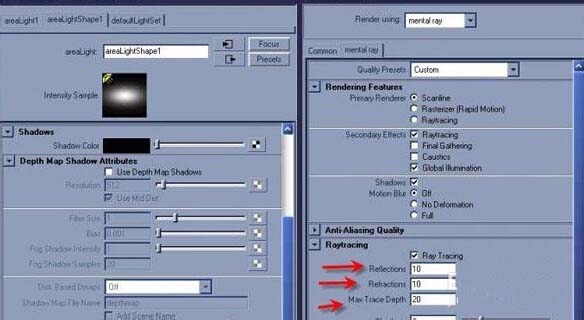 5、在燈光的屬性里,增加Shadow Ray 和 Ray Depth Limit,然后渲染設置Window>>Rendering Editors>>Render Settings。打開 Raytracing卷,
