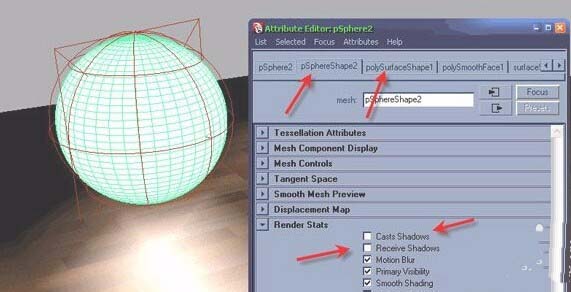 10、打開屬性編輯器,分別取消點選pSphereShape 和 polySurfaceShapeCast的 Shadows 和 Receive Shadows。