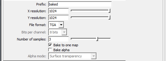 5、接下來將prefix 設置為 baked ,下面x/y resolution(貼圖大小)設置自己所要的大小 ,下面是文件存儲格式。將Number of samples的值設置為3,或根據自己的情況而定,并勾選Bake to one map。