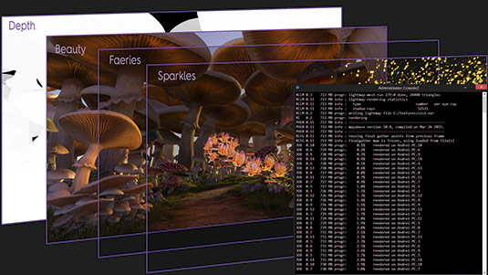 草的取樣與SSS著色器的計算成本高。額外的電腦能對渲染起到巨大幫助,甚至個別結構(通過使用Mental Ray衛星)。這也有利于學習如何使用命令行渲染,并可以廣泛應用的渲染層。通過使用每個對象一個物料來避免某些渲染層的問題。通常要有充足的美化、深入與修飾材料通道,除了字符與效果通道。