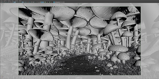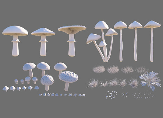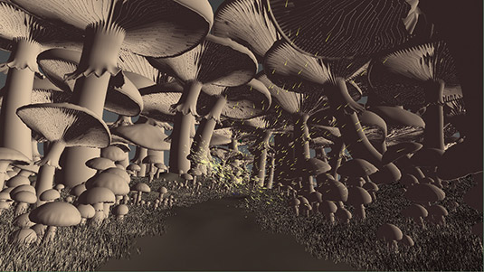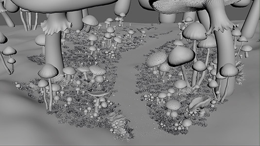 大的蘑菇在Maya中創建模型,然后在Mudbox中細化模型。導出雕刻圖層作為矢量位置換貼圖在mental ray中使用。較小的蘑菇的細節不是那么重要,可以用簡單的幾何體表達。草地模型可以由Paint Effects軟件預設生成,針對不同的變化進行調整及優化。注意多邊形的細分級別,這對內存要求是有很大影響的。