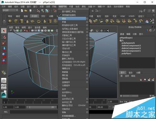 2、我們選中其中一條邊,然后找到”編輯網格-擠出“命令,點擊這個命令。