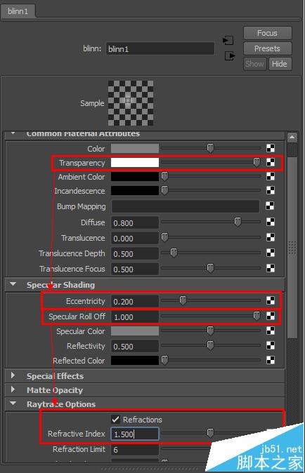 4、調(diào)節(jié)此Blin材質(zhì),透明度、反光、折射參數(shù),如圖: