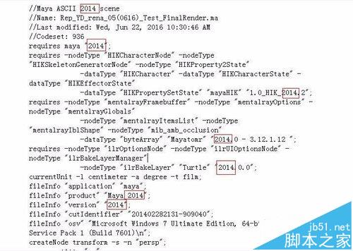 2、只有一種方法比較實用,可以先將maya文件保存為.ma文件,然后以記事本或者寫字板的方式打開,將代碼中的2015替換為2014即可!如圖