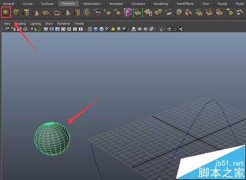 3、在上面的常用工具選項里找到polygons選項,在polygons下找到sphere,在視圖里創建一個球體,如圖所示: