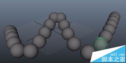 7、點擊create animation snapshot命令,可以看到視圖里沿著曲線就創建出來了許多球體,這是在每一幀上復制創建一個球體,如圖所示: