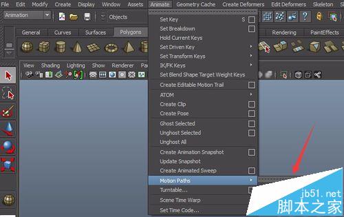4、選擇球體,按下鍵盤的Shift鍵加選曲線,在上面的animate菜單里找到motion paths選下的attach topaths命令,如圖所示: