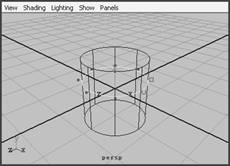 另一種生成曲線的方法是 Duplicate Surface Curves ,實際上,這種方法并不是屬于 Create 菜單,而是在 Edit Curve 菜單上。這是一種非常有效的曲線生成方法,特別是它能夠復(fù)制一個面上所有的等參線。試著使用該工具,生成一個默認(rèn)的圓柱,顯示等參線,在表面上任意選擇一個等參線,選擇 Edit Curves Duplicate Surface Curves 命令。這樣,一條和圓柱有同樣數(shù)目段的曲線已經(jīng)復(fù)制成了,如圖 4-35 所示。