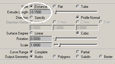 當新投影的曲線仍然被選擇的時候,到 surfacesextrudeoption box , 將 style 設為 distance , extrude length 設為 -0.15. output geometry 設為 nurbs (fig 7), 設定好后點擊 extrude , 我們將得到如 (fig 8) 所示