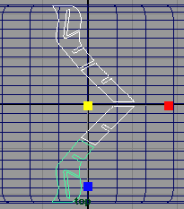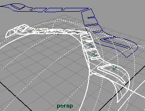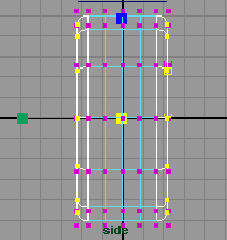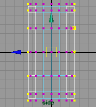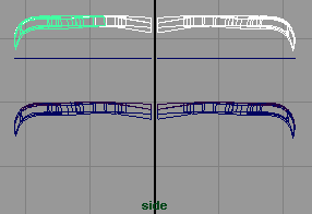 切換到側視窗中,選擇外沿的 CV 點 (fig 3) 將它們拉伸如 (fig 4). 注意 : 使用中心黃點來拉伸 .