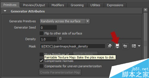 下面我們要設置Ptex貼圖,在彈出的窗口中點擊generate按鈕來生成叢快貼圖,Densily值大家根據自己的情況來設置,本例中0.2.,點擊保存。