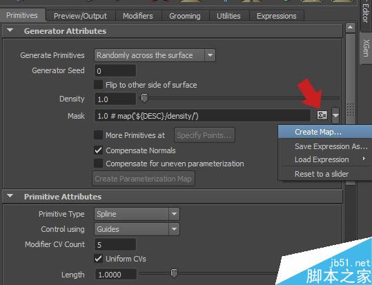 接下來我們通過繪制遮罩來控制密度,由于xGen是基于Ptex的,但是Maya的3Dpaint工具時使用UV來繪制的。這里我用了一個小竅門來得到一個新的符合Ptex的UV:創建一個新的uvSet,把他拷貝到map1,所有的uv就都消失了,然后刪除新建的這個uvSet