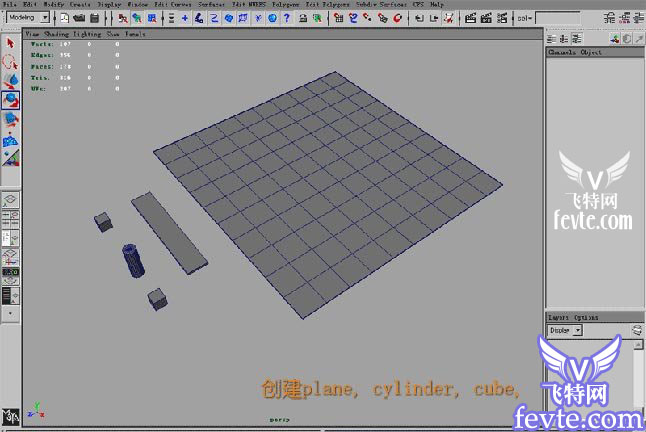首先我們在MAYA中創建一個plane、cylinder和cube,如圖所示。