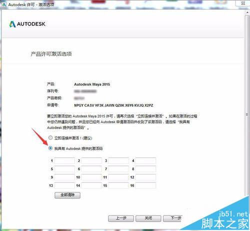 11、選擇”我具有AUTODESK激活碼“選項。使用注冊機算出激活碼。填入文本框中。下一步。