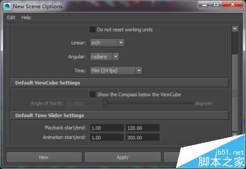 2、現在,我們可以設定一下每次啟動,配置的一些參數了,比如說動畫時間滑塊的幀數。maya默認總長度是48幀,如果我們方便使用的是500幀數,可以通過點擊菜單中的“file”->“new scene”來設定。以此還可以設置幀數播放速率的。