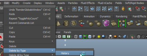 5、為工具架中添加自己常用的功能項。比如將刪除選中物體的歷史功能添加到polygons工具欄中,我們先選中“polygons”這一欄,然后找到刪除選中物體歷史功能的菜單選項。按住鼠標的“Ctrl+Shift”按鍵,鼠標左鍵點擊這個功能項,就可以完成添加了。