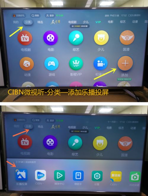第一步,先在PPTV電視上,下載安裝CIBN微視聽這個軟件,下載之后打開它,在我的應用——添加應用——添加樂播投屏。