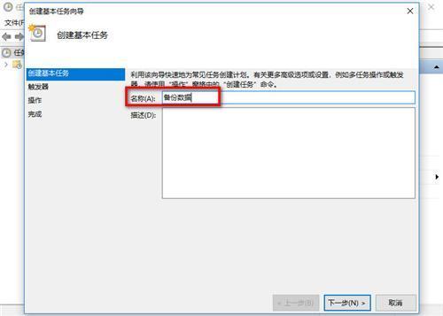 4.進(jìn)入到“創(chuàng)建基本任務(wù)向?qū)?rdquo;,在第一項(xiàng)的“創(chuàng)建基本任務(wù)”面板中為任務(wù)計(jì)劃起名,例如為這個(gè)任務(wù)起名為“數(shù)據(jù)備份”,完成后進(jìn)入下一步。