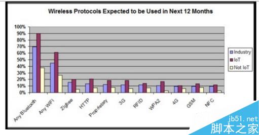 1、根據(jù)第三方機(jī)構(gòu)的市場調(diào)查,藍(lán)牙已經(jīng)成為了最受歡迎的物聯(lián)網(wǎng)無線協(xié)議(如下圖),而Wi-Fi市場占有率遠(yuǎn)遠(yuǎn)落后,排在第三位的是專門的物聯(lián)網(wǎng)無線標(biāo)準(zhǔn)Zigbee。