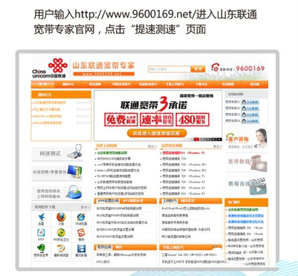 在瀏覽器中打開山東聯通寬帶專家頁面,點擊“提速測試”頁面進行升級,如圖。