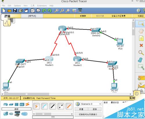 1、首先打開思科模擬器軟件,找到3臺2811類的路由器和3臺交換機,3臺電腦,若干條電纜,進行連接,路由器與路由器之間用DCE串口線連接,電腦和電腦之間用直通線連接,如下圖所示: