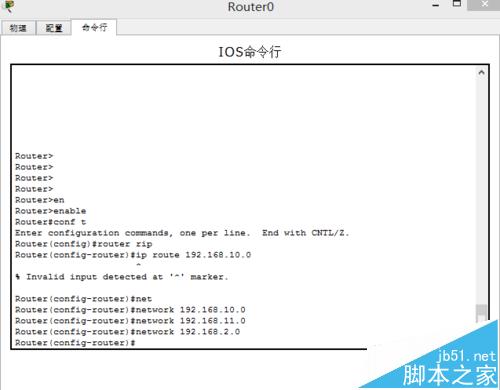6、配置動態路由rip配置,給每臺路由器都配置rip配置,如給路由器a配置動態路由rip,命令是: