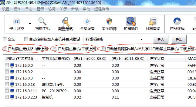 圖:聚生網(wǎng)管禁止無線路由器接入局域網(wǎng)、禁止隨身wifi使用、禁止手機(jī)平板上網(wǎng)