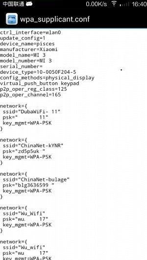3、最后我們再在wifi目錄里找到wpa_supplicant.conf文件,然后使用文本查看器打開查看,在這里變即可查看到所有之前我們手機連接過的Wifi密碼,如下圖所示:
