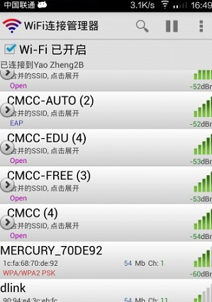 2、打開Wifi連接管理器之后,我們就可以看到,手機之前連接過的所有WiFI網絡名稱,如下圖所示。