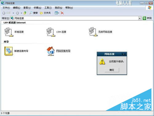 右鍵點擊本地連接,出現:網絡連接,出現意外錯誤。 的提示。