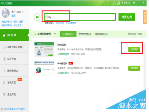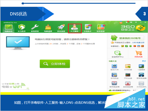 如圖,打開殺毒軟件-人工服務(wù)-輸入DNS-點擊DNS優(yōu)選,解決網(wǎng)頁打不開的問題。