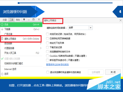 如圖,打開瀏覽器,點擊工具-清除上網(wǎng)痕跡。瀏覽器緩存問題導(dǎo)致某些網(wǎng)站不能打開。