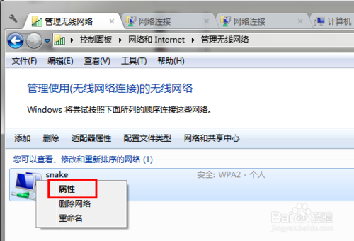 3、“管理使用的無線網路”中,找到之前保存的網絡配置,在網絡配置上右鍵,選擇“屬性”