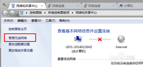 2、打開“網絡和共享中心 ”窗口之后,找到左側功能列表中的“管理無線網絡”,并點擊進入。