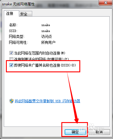 4、在無線網絡屬性窗口中,勾選“即使網絡未廣播其名稱也連接(SSID)”,點“確定”保存