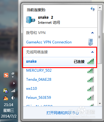 1、桌面右下角,鼠標左鍵點擊無線網絡圖標,彈出無線網絡列表,點擊“打開網絡和共享中心”。