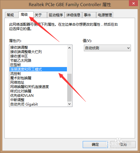 5、選擇高級,在下拉列表中找到連接速度和雙工模式