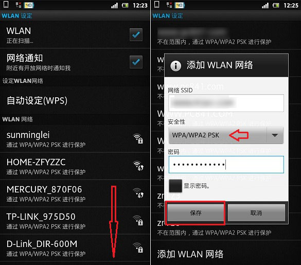 2、進(jìn)入安卓手機(jī)無(wú)線網(wǎng)絡(luò)設(shè)置后,會(huì)看到可以搜索到很多無(wú)線網(wǎng)絡(luò)信號(hào),由于自家的無(wú)線網(wǎng)絡(luò)SSID名稱隱藏,因此我們無(wú)法直接看到需要連接的無(wú)線網(wǎng)絡(luò)名稱,而是需要點(diǎn)擊最底部的【添加WLAN網(wǎng)絡(luò)】,接下來(lái)需要輸入隱藏的SSID名稱、安全性里面選擇【W(wǎng)PA/WPA2 PSK】,最后在下方的密碼處填寫上無(wú)線網(wǎng)絡(luò)密碼即可,完成后,點(diǎn)擊“保存”即可,如下示意圖所示。