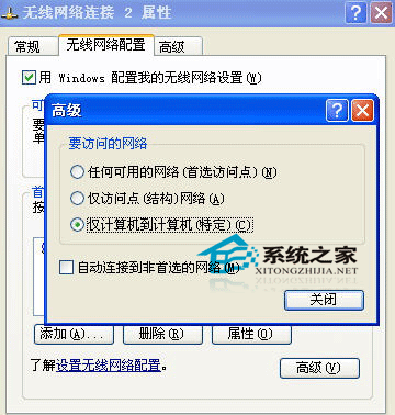 2、然后,點擊主機的無線網絡連接屬性窗口的 “無線網絡配置”,選中“用windows配置我的無線網絡設置”,點擊下方的“高級”,在要訪問的網絡里,勾上“僅計算機到計算機(待定)”,不要勾選“自動連接到非首選的網絡”。如圖二所示: