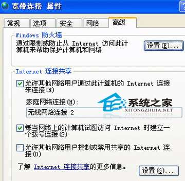 4、第四,配置主機的寬帶撥號連接屬性“ 高級”,勾選“允許其他用戶通過此計算機的Internet來連接”和“每當網絡上的計算機試圖訪問Internet時建立一個撥號連接”。如圖四所示: