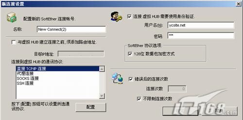 接下來打開桌面上的“SOFTETHER連接管理器”,在打開的窗口中單擊“帳號”菜單下的“新帳號”命令,在打開的“新連接設置”窗口中為配置新的SoftEther連接帳號輸入一個名稱,可隨便取,只要便于分辯和記憶即可;在“連接到虛擬HUB的通訊協議”中選擇“直接TCP/IP連接”項并單擊“配置”按鈕,在彈出的窗口中輸入對方公網真實IP地址,保持默認端口值7777,單擊“確定”返回;再選中右側的“連接虛擬HUB需要使用身份驗證”選項,并輸入在服務端配置的帳號和密碼,做好設置后單擊“確定”(圖3)。
