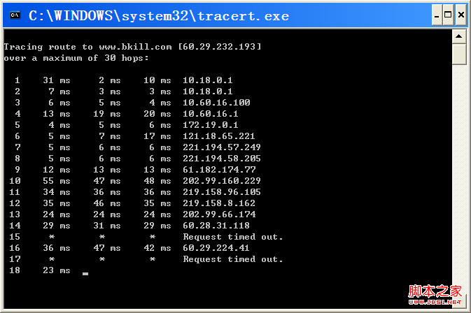 點確認或回車后即可進入命令模式窗口,我們在里面輸入tracert -d www.bkill.com 之后按下回車鍵確認即可追蹤到本地電腦到比克爾網站所在地的路由器線路。如下圖: