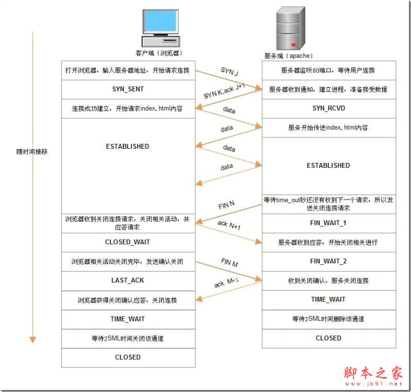 瀏覽器(IE,火狐,谷歌等)和apache都是基于http協議進行通訊的。瀏覽器在客戶端,apache在服務端。http協議是在TCP/IP模型中的應用層。TCP協議狀態在TCP/IP模型中的傳輸層。在瀏覽一個網站的時候,如果關閉了瀏覽器,只是關閉了瀏覽器的進程,瀏覽器和apache之間的連接還沒有完全斷開。操作系統會在一定時間后自動斷開該連接。服務端也是一樣,雖然apache的進程已經關閉了,但是連接不會立刻斷開,linux操作系統會在一定時間后斷開該連接。