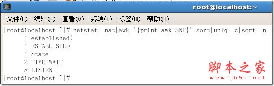 #netstat -nat|awk ‘{print awk $NF}’|sort|uniq -c|sort –n