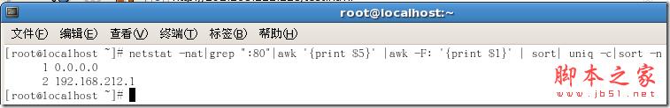 #netstat -nat|grep “:80″|awk ‘{print $5}’ |awk -F: ‘{print $1}’ | sort| uniq -c|sort -n